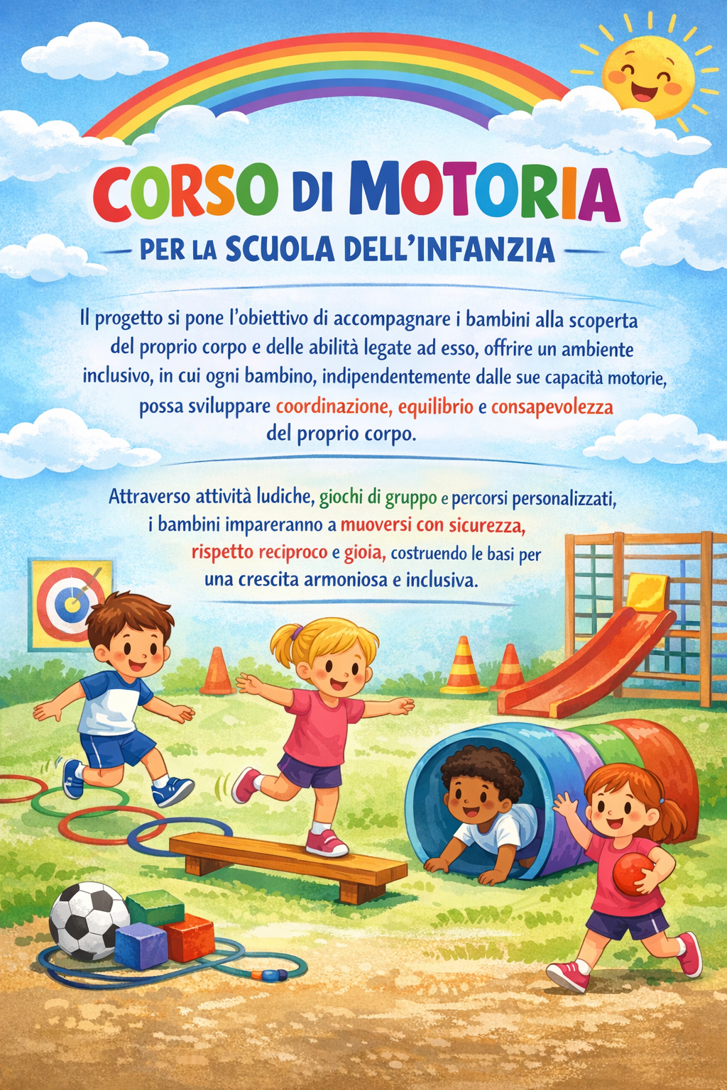 Il progetto si pone l’obiettivo di accompagnare i bambini alla scoperta del proprio corpo e delle abilità legate ad esso, di offrire un ambiente inclusivo in cui ogni bambino, indipendentemente dalle sue capacità motorie, possa sviluppare coordinazione, equilibrio e consapevolezza del proprio corpo.
